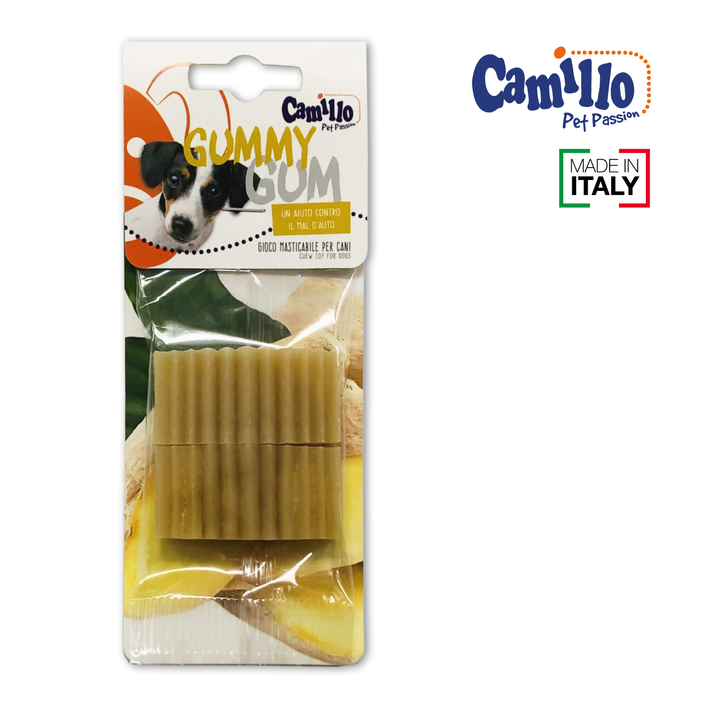 Gummy Gum Flat è un gioco da masticare per cani. Aromatizzato allo zenzero, aiuta contro il mal d’auto. Pratico e facile da tenere sempre a portata di mano.