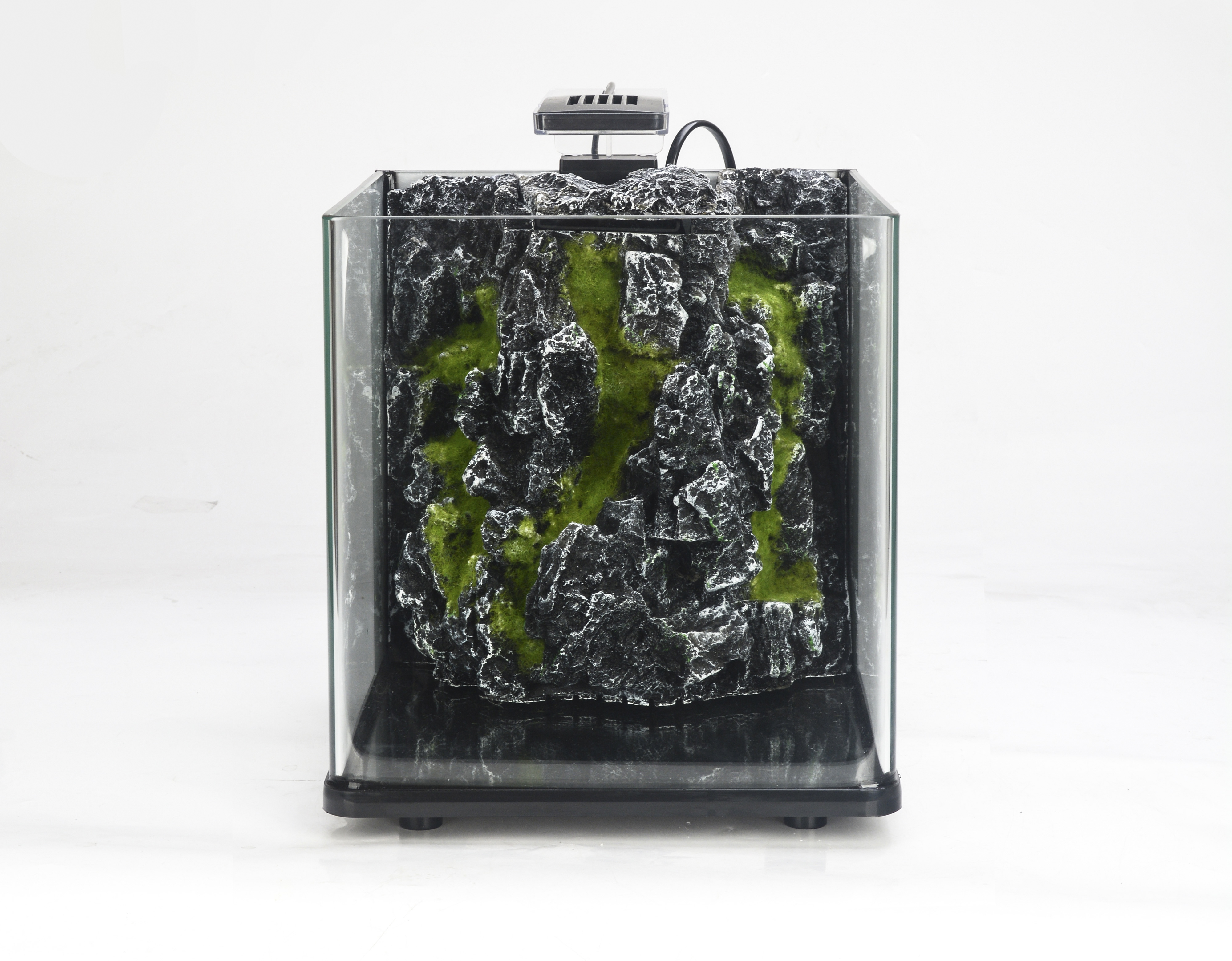 Acquario in vetro curvato, con filtro biologico integrato, accessoriato con pompa, materiali filtranti e illuminazione a led. Con sfondo tridimensionale in resina.