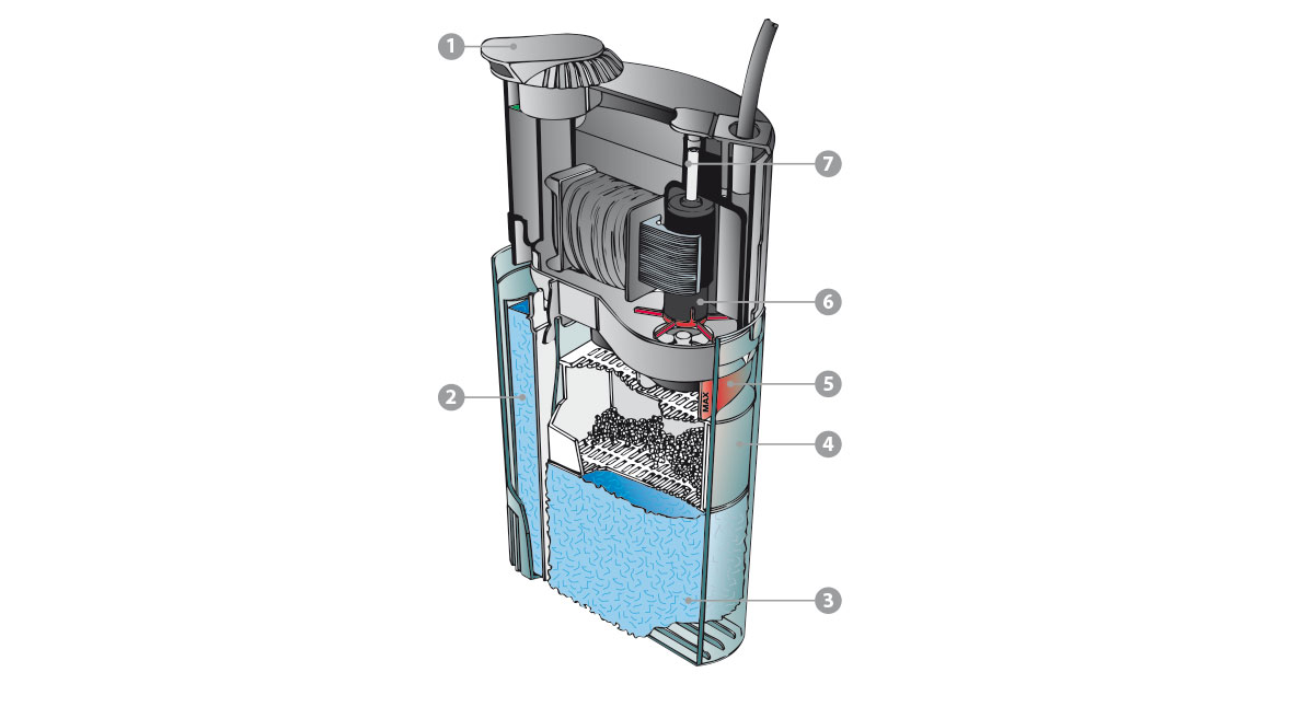 Filtro interno multifunzionale. Tripla azione filtrante. Portata regolabile. Aerazione incorporata. Motore autoprotetto da surriscaldamento. Silenzioso, versatile e completo di accessori.
