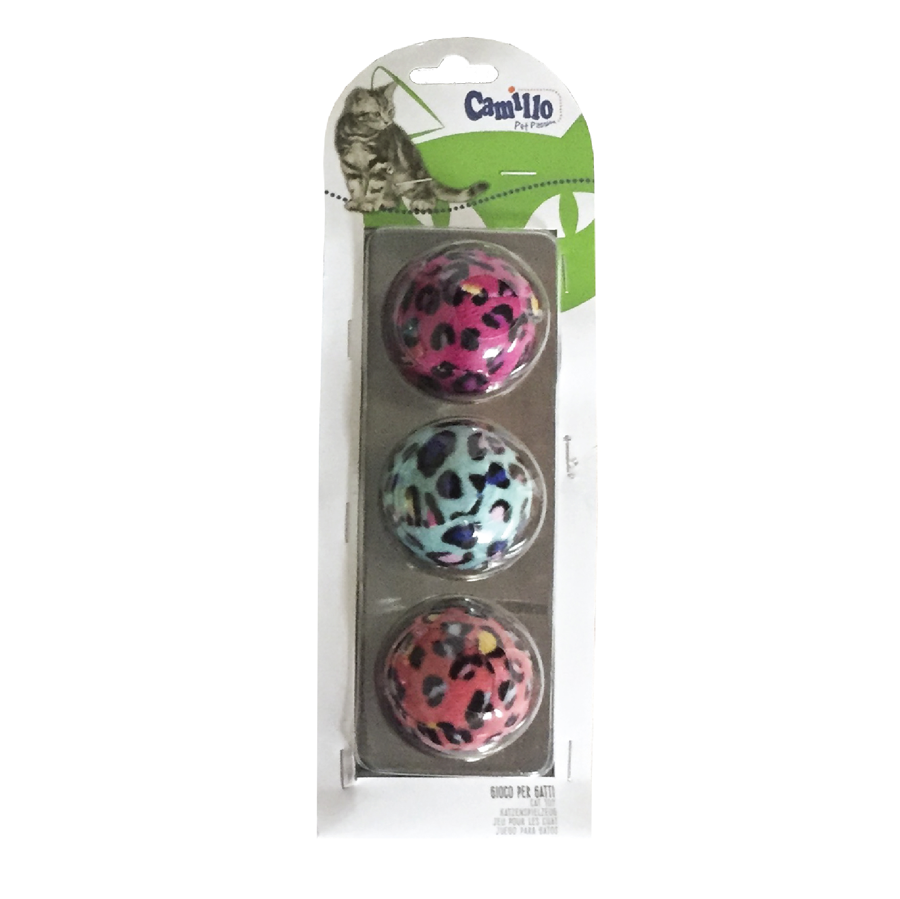 La pallina, il più classico e amato gioco per gatti, in una versione Leopard colorata. Il vostro gatto si divertirà a rincorrerla! Confezione contenente 3 palline in colori assortiti.