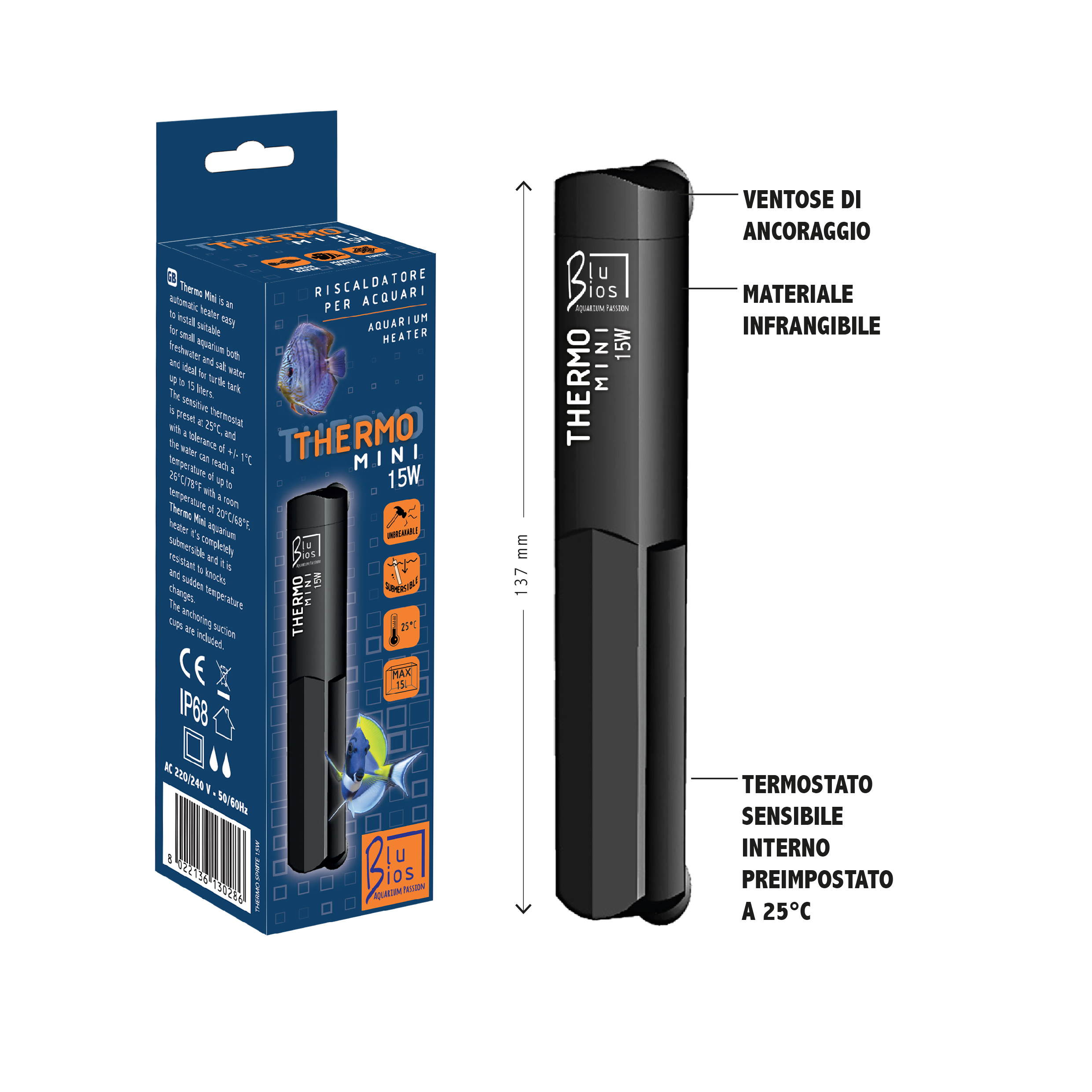– Thermo Mini 15W | Cod. AM125015 | Barcode 8022136130286 | Dimensione: 13,7cm | Voltaggio: 220V / 50Hz | per acquari fino a 15 litri
